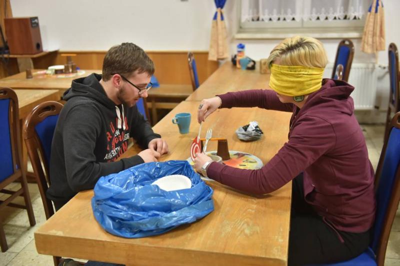 V pátek podvečer se všichni účastníci postupně slezli na Relaxe, kde nás po večeři čekala praktická ukázka indoor her. Na začátek jsme si procvičili své pantomimické, řečové a hmatové dovednosti u oblíbené hry Stavitelé, ve které se slepý dělník snaží postavit dle pokynů stavbyvedoucího, který mu slovně vysvětluje, co má dělat. Stavbyvedoucí přijímá pokyny od architekta, který však nemůže mluvit - tedy pomocí pantomimy vysvětluje, co se má stavět, jako jediný totiž zná zadání.