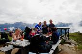 Den třetí...ještě je hluboká noc a mnohým se zdá sen o tom, jak jsou slavnou cestovatelskou celebritou a žijí v záři blesků fotoaparátů. Když se pak podesáté za noc zkutálí z karimatky a otevřou oči, světe div se, to nebyl sen, opět záře blesků! Bohužel ne těch z fotoaparátu. Nejvíc si blesků užívá Hanka. Jako odpovědná vedoucí výpravy místo spánku pozoruje oblohu, a hodinu a půl se rozhoduje, jestli vydá povel rychlého přesunu do dědovy chalupy, nebo jestli silou vůle bouřku zažene....za svítání se pak postupně probouzíme všichni...mnozí poté co sáhnou na svůj zcela mokrý spacák mají obavu, že se v noci asi báli a stalo se jim ze strachu to nejhorší co se může stát a čím se nedá mezi kamarády zrovna pochlubit...óóó jak příjemné je zjištění, že za mokrý spacák může neskutečně vydatná alpská rosa. Lezeme ze spacáků, a za deního světla se divíme, na čem jsme dokázali v noci spát. Nutno říci, že někdo se probouzí i poměrně daleko od své karimatky. Nuže, vzhůru k tyrolskému dědovi na terasu, dáme si snídani.