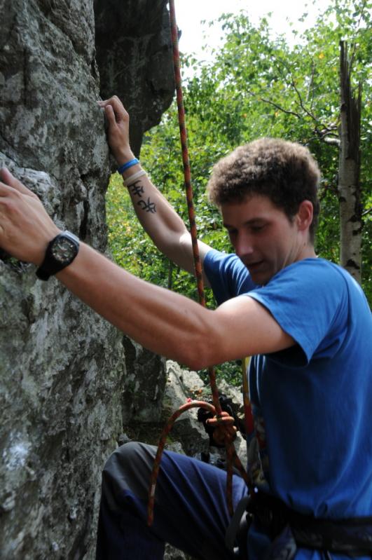 Ráno se rozdělujeme na poloviny, jedna odchází slaňovat pomocí různých věciček- pomocí osmy a kyblíku. Druhá polovina se pokouší uvázat nějaké uzly. Inovace jsou i v tomto odvětví horolezectví vítány, ovšem, je vhodné pokud nový model uzlu má vyšší pevnost nebo lepší vlastnosti než uzel předchozí, což se o našich veledílech doopravdy říct nedá... Po prostřídání ještě testujeme, jak bychom zvládli různé týmovky. Až na to, že by jedna skupina vyhodila pomocí bomby (voda v kýblu) nejbližší okolí do povětří, tak nám to i celkem šlo. Po obědě se opět dělíme na poloviny, jedna míří pod stěnu, druhá k trampolíně. Na trampolíně všichni předvádí psí kusy, dokud se jim nezačne oběd v žaludku převracet v rytmu jejich výskoků. To na stěně zase všichni, kdo stojí dole, radí a radí, ale jakmile přijde jejich okamžik a oni zoufale visí na laně a bezmocně rozhazují ručkama, to už mlčí :-) Po střídačce následují další týmové hry, kdy se poslepu snažíme najít tenisák, projít střediskem a trefit dojít k terči na lukostřelbu. Inu, ne vždy platí heslo "risk je zisk" a po několika minutách bloudění po středisku, kdy co chvíli zakopáváte o kameny, palisádu, o nohy toho, kdo jde před vámi, už jste doopravdy vděční, když narazíte do něčeho a můžete s čistým svědomím říct, že jste ještě nikdy neměli z nárazu větší radost, než když jste narazili do toho terče.