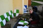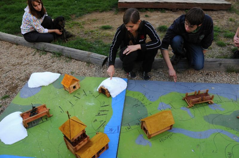 Takový herní plán jsme ještě neměli. Na obrázku varianta pro Tajemnou tvrz, samozřejmě v tuto chvíli ještě rozpracovaná. I tak už je nyní za vedoucími několik desítek hodin práce na tomto plánu. Na obrázku patrné výkresy tužkou, Niki a Kuba propočítávají počet polí a umístění staveb.